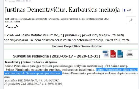 Straipsnyje skambiu pavadinimu „Karbauskis meluoja” bandoma skaitytojui melagingai įteigti, kad R. Karbauskio pareiškimai apie ribojamas opozicijos teises pagrindo neturi. Tuo tikslu meluojama net dėl Statuto turinio.