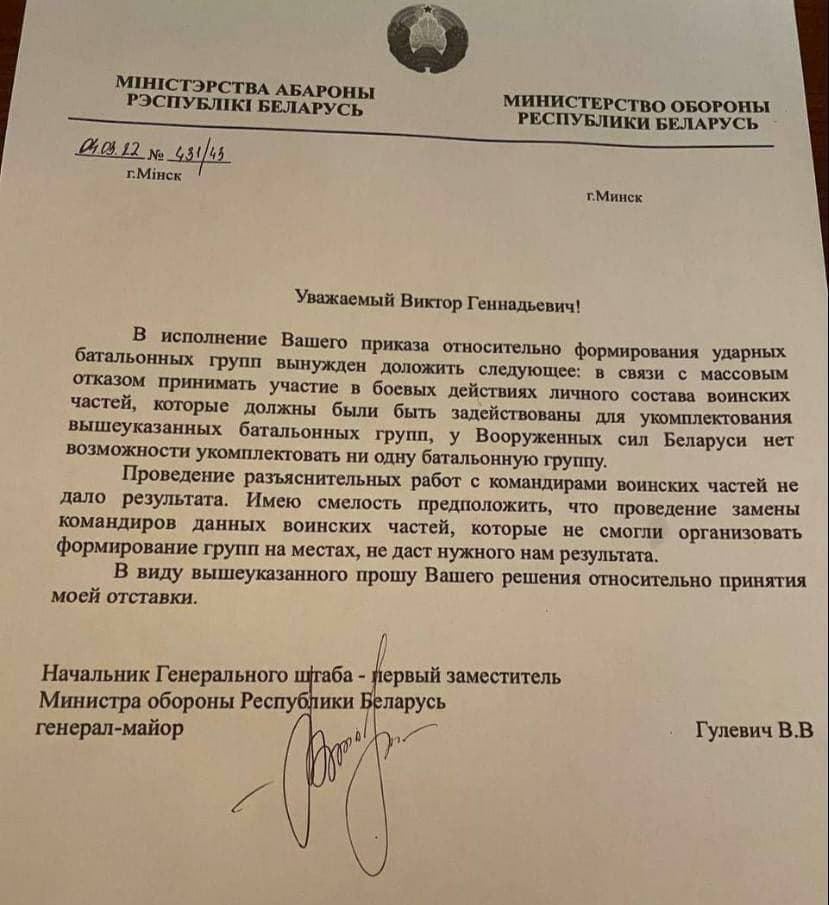 Atsistatydino Baltarusijos Generalinio štabo viršininkas V.V. Gulievičius.