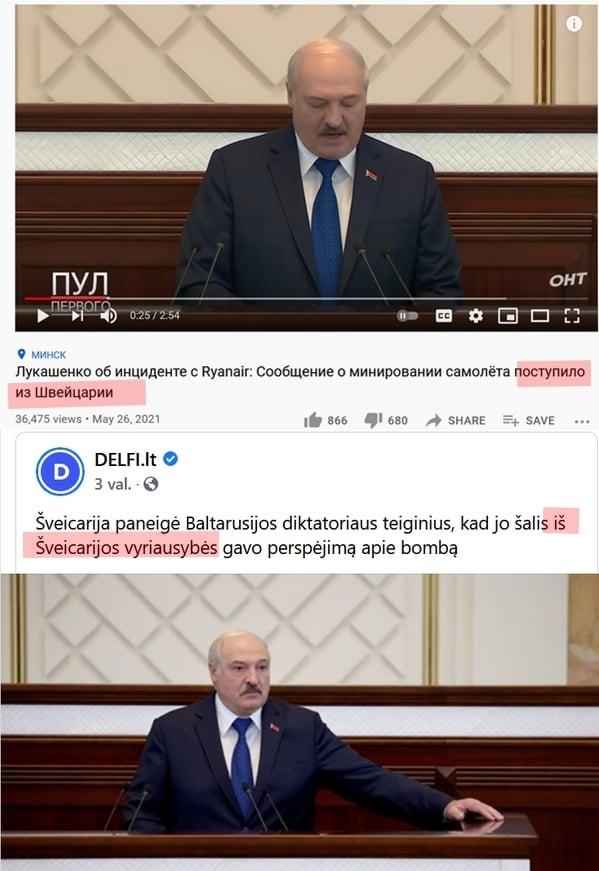 Kaip leftistinė žiniasklaida gamina melagieną: Lukašenka pasako, kad pranešimas apie užminuotą lėktuvą „atėjo iš užsienio – iš Šveicarijos”.