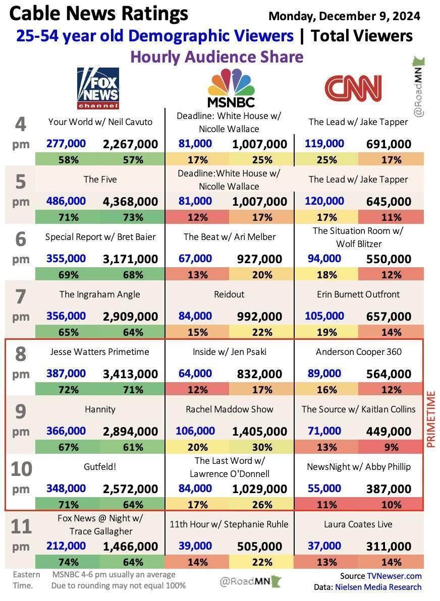 Savaitę, kuri baigėsi lapkričio 24 d., MSNBC vidutiniškai stebėjo 632 000 žiūrovų geriausiu laiku, palyginti su 1,34 mln. žiūrovų savaitę, kuri baigėsi lapkričio 3 d. – paskutinę visą savaitę prieš rinkimus.