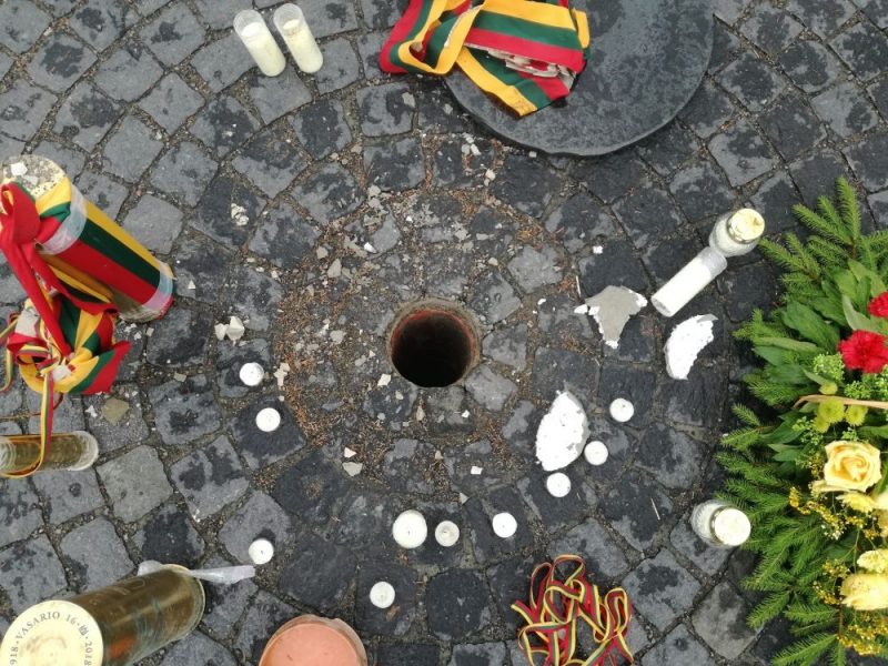 Nuotraukos iš Vikipedijos – Vandalizmo aktai Lukiškių aikštėje. Vaizdai; Iš Lukiškių aikštės savivaldybės nurodymu pašalintos plokštės su relikvijų sąrašais.
