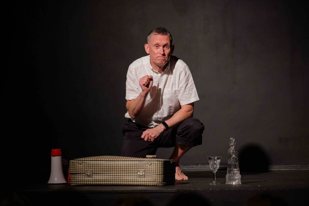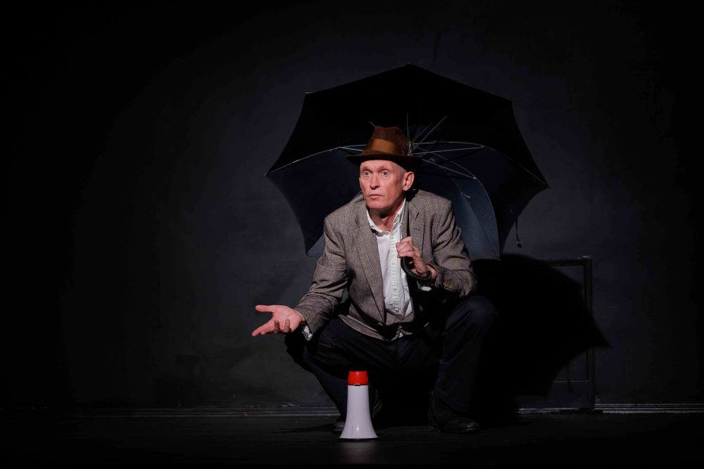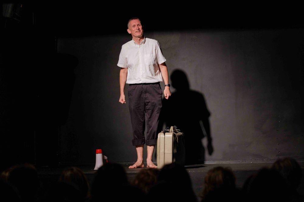 Spektaklio „Žemė dega“ akimirkos. Režisierė Kotryna Siaurusaitytė. Aktorius Arūnas Vozbutas.