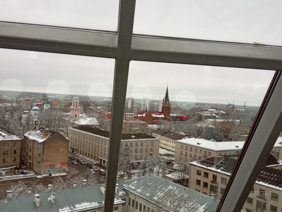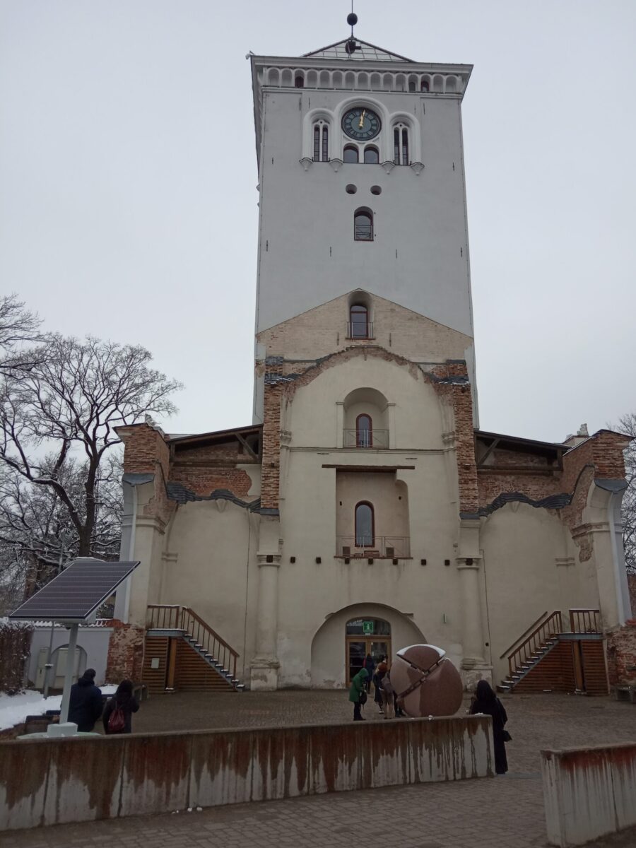 Bokštą 2004 metais uždengė stiklinis stogas. Pakilę į viršutiniame aukšte esančią apžvalgos aikštelę visą Jelgavą matome kaip ant delno. Ekskursijų vadovė rodo pačius svarbiausius miesto objektus, kurių, nepaisant negailestingos istorijos, yra išlikę pakankamai daug. Štai – vienas didžiausių ne tik Jelgavoje, bet ir visose Baltijos šalyse barokinių statinių – rūmai (kai kas juos vadina pilimi), buvę Kuršo kunigaikščio Ernesto Birono rezidencija. XVIII a. iškilę pagal garsaus architekto B.Rastrelio projektą, nesyk degę ir patyrę karo metų sugriovimus, rūmai atgijo tarsi Feniksas iš pelenų. Pastate dabar įsikūrusios Latvijos žemės ūkio universiteto auditorijos, be to, esama dviejų nedidelių muziejų. Viename iš jų galima susipažinti su rūmų istorija, pasižiūrėti į prarastų vidaus interjerų archyvines fotografijas, o kitas muziejus yra sarkofagų buveinė. Mat čia – Kurliandijos hercogų amžinojo poilsio vieta.