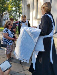 Tai buvo „Kleboniškos virenės pasakojimai“, nukėlę mus į XX a. pradžią, kai Kuliuose klebonui talkino dvi jo seserys ir jų žvitrios pagalbininkės. Susodinusios už ilgų stalų, aktorės taip porino apie klebonijos ir Kulių gyvenimą, kad atsiklausyti negalėjome. Oho, kiek čia įdomių nutikimų būta! Aišku, prisimintas buvo ir Vaižgantas, ir klebonijoje vaikystėje gyvenusi Sofija Kymantaitė… O aprodžiusios savo klebonišką ūkį, svetingos šeimininkės ir kiaušiniene pavaišino, ir arbatos su pyragu pasiūlė. Pasijutome, lyg pas artimus gimines pabuvoję…