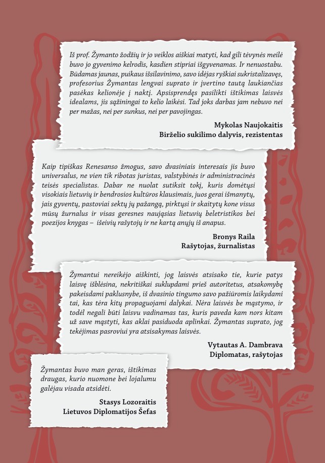 Trečioji dalis – Lietuvių tautos rezistencijos tematika, kur ašine asmenybe tampa profesorius Mykolas Biržiška. Paskutinysis knygos skirtas pačiai S. Žakevičiaus-Žymanto asmenybei, kurios veiklą, bruožus istorinėse peripetijose atskleidžia V. A. Dambravos, B. Railos, A. Gustaičio ir kitų tekstai. Autorės įvadiniame straipsnyje itin taikliai apibrėžtas šios skyriaus, o kartu ir knygos turinys – S. Žakevičiaus-Žymanto grąžinimas Lietuvai, tiek atmintimi, tiek veikliu turiniu, tiek į jam istorijos nubrėžtą lauką.
