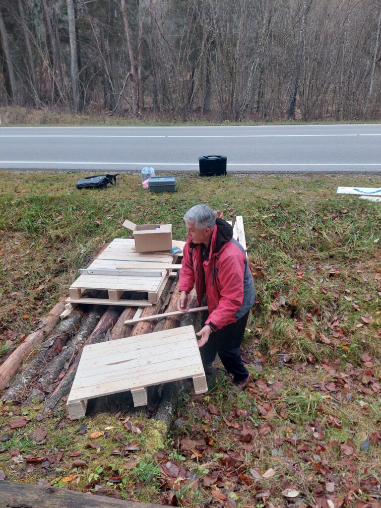 Atvykę pamatėme, kad aplinka reikalauja tvarkymo. Ypač pavojingas buvo tiltelis per griovį, vedantis prie paminklo – keli rąstai, seniai be žievės, tapę slidūs ir nesaugūs. Nusprendėme nedelsti ir sutvarkyti jį patys. Tokie darbai – irgi mūsų pagarba istorijai. Juk nereikia, o gal ir nevalia laukti, kol tai padarys institucijos. Paminklą pastačiusieji žmonės jau atliko milžinišką darbą savo lėšomis, todėl toliau prisidėti – visuomenės pareiga.