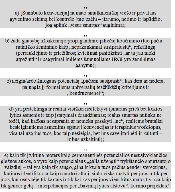 Aiškindama kodėl nepalaiko Stambulo konvencijos (pilnas pavadinimas: Europos Tarybos konvencija „Dėl smurto prieš moteris ir smurto artimoje aplinkoje prevencijos ir šalinimo“) ratifikavimo filosofė Nida Vasiliauskaitė atmetė konservatyvių krikščionių akcentuojamas gender ideologijos grėsmes, tuo pačiu iškeldama kitus problemiškus konvencijos aspektus.