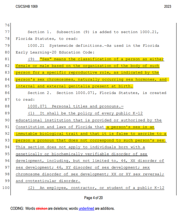 Kiekvienoje valstybinėje K-12 švietimo įstaigoje, kuri yra aprūpinama ar įgaliota veikti pagal Floridos Konstituciją ir įstatymus, turi būti laikomasi politikos, kad asmens lytis yra nekintamas biologinis požymis ir kad neteisinga priskirti asmeniui įvardį, kuris neatitinka jo lyties. Šis skirsnis netaikomas asmenims, gimusiems su genetiškai ar biochemiškai patikrinamais lytinio vystymosi sutrikimais, įskaitant, bet neapsiribojant, XX tipo lytinio vystymosi sutrikimą; XY tipo lyties vystymosi sutrikimą; 98 lytinės chromosomos vystymosi sutrikimą; XX arba XY lytinių chromosomų reversą; kiaušidžių-sėklidžių sutrikimą.