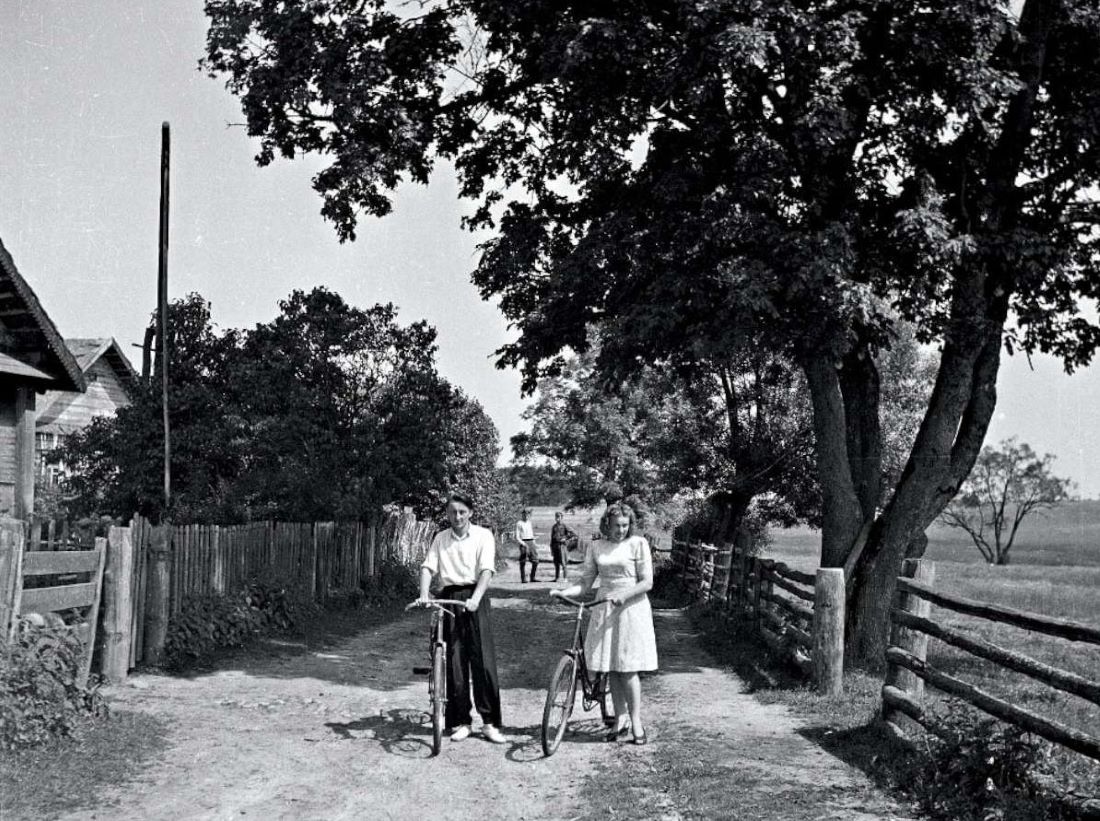 Dieveniškių miestelio (Šalčininkų r.) gatve dviračius besivedantys jaunuoliai. 1952 m. LTR Ft D 802. | J. Dovydaičio nuotr.
