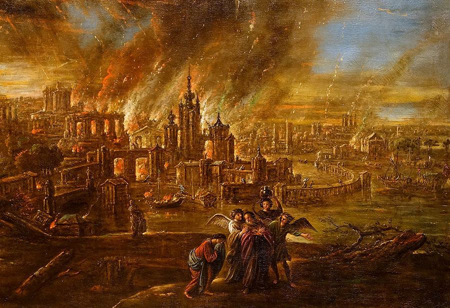 „Jiems dar nesugulus, miesto vyrai – Sodomos vyrai, jauni ir seni, visi žmonės iki paskutinio – apsupo namus ir šaukė Lotui: „Kur tie vyrai, atėjusieji pas tave šį vakarą? Atvesk juos mums, kad galėtume juos pažinti“… Tuomet anie vyrai klausė Lotą: „Ką daugiau iš savųjų čia turi?.. Mes šią vietą tuojau sunaikinsime. Šauksmas prieš Sodomos žmones, pasiekęs Viešpatį, pasidarė toks garsus, kad Viešpats atsiuntė mus jos sunaikinti“… Tuomet Viešpats liejo ant Sodomos ir Gomoros sierą ir ugnį. Jis sunaikino tuos miestus ir visą Lygumą drauge su visais miestų gyventojais ir žemės augmenija“ (Pr 19, 4–25).