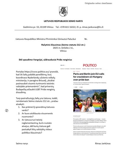 Birželio 2-ąją Seimo narys Rimas Jankūnas kreipėsi į Ministrą Pirmininką Gintautą Palucką, siekdamas išsiaiškinti – kas priėmė sprendimą Lietuvos vardu prisidėti prie 16 Europos Sąjungos šalių pasirašyto pareiškimo, raginančio Briuselį „skubiai pasinaudoti visomis turimomis teisinės valstybės priemonėmis“, kad priverstų Vengriją atšaukti seksualinių mažumų eitynių draudimą.