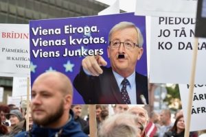 Latvijoje vyko protestai prieš pabėgėlių perkėlimą į šalį (taip pat ir Estijoje). Getty nuotrauka „Manau, ekonominiai pabėgėliai keliauja į Europą, nes žino, jog kas nors juos išgelbės, – teigia judėjimo Katanijoje, rytinėje Sicilijos pakrantėje, koordinatorius Lorenzo Fiato. – Šios problemos negalima spręsti talkinant kontrabandininkams žmonėmis.“