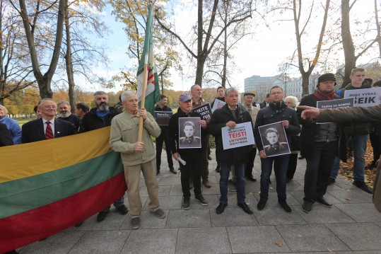Laisvės kovotojų, tremtinių ir kitos patriotinės organizacijos antradienį surengė protestą prie URM ir ragina ministerijos vadovą Liną Linkevičių atsiprašyti ir nebešmeižti partizano Jono Noreikos (Generolas Vėtra). Irmanto Sidarevičiaus nuotr.