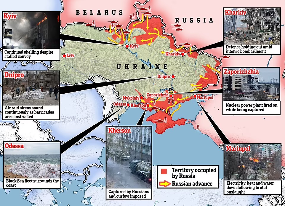 Dar vasario 24 d. vakare vienas Rusijos atsargos generolas pareiškė, kad Rusijos armija įgyvendino visus uždavinius, kad ukrainiečiai bėga, oro erdvę kontroliuoja rusai, kad ukrainiečių oro gynyba sutriuškinta, ir kad rytoj bus paimtas Kijevas ir kiti didieji miestai. Šiandien 8 karo diena, tačiau nė vienas iš paminėtų uždavinių neįgyvendintas.