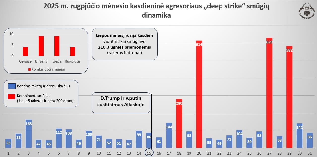 - Rugpjūčio 15 d. suplanuotas D. Trumpo ir v. putino susitikimas Aliaskoje bei tarptautinė darbotvarkė skatino rusiją sumažinti smūgių intensyvumą, jį perkelti arčiau kontaktinės linijos. Po susitikimo Aliaskoje dideli kombinuoti smūgiai atsinaujino.