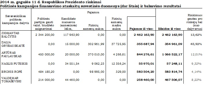 Žinoma, šiuo metu kandidatų surinktos lėšos nėra įspūdingos. Galima būtų prisiminti praėjusių, 2014 m., Prezidento rinkimų kampanijos patirtį (žr. lentelę žemiau). Tuomet būsimoji Prezidentė rinkimų kampanijai surinko ir išleido virš 350 tūkstančių Lt, t. y. – virš 100 tūkstančių €.