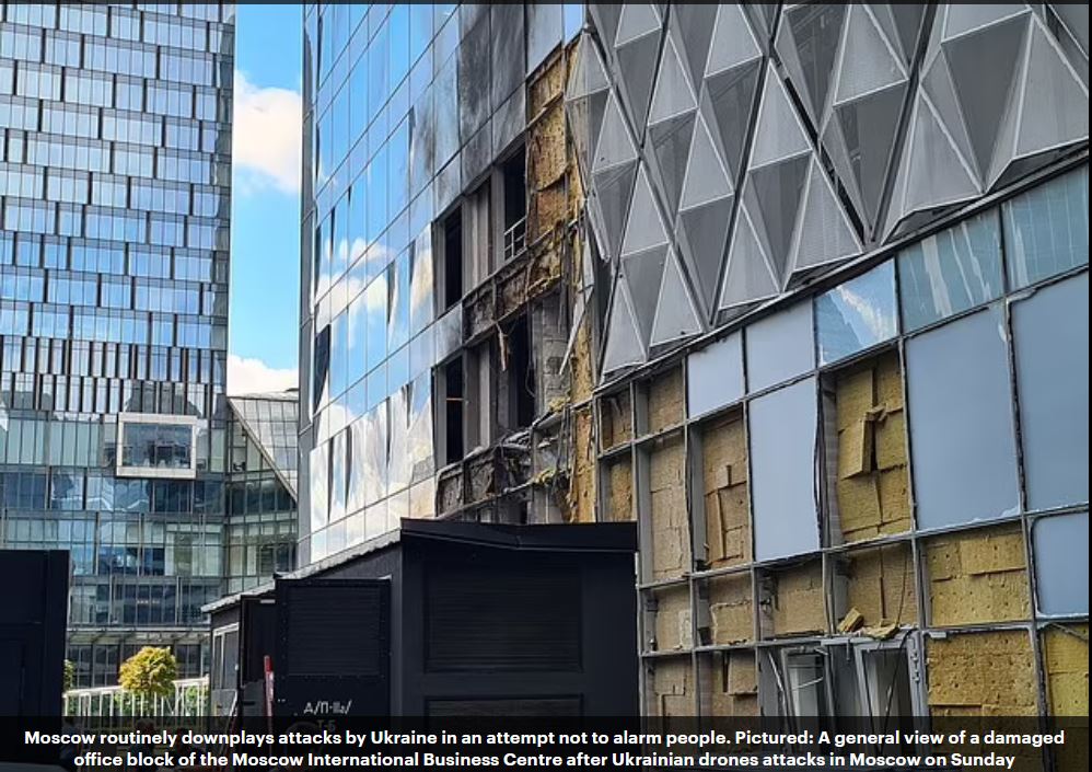 Taigi išpuolis pasiekė pačią Maskvos širdį, netoli Rusijos vyriausybės Baltųjų rūmų būstinės.Viename iš pastatų, į kuriuos smogė dronai, įsikūrusios Ekonominės plėtros bei Pramonės ir prekybos ministerijos Svetainė , Skaitmeninės plėtros, telekomunikacijų ir masinės informacijos , taip pat čia įsikūręs ir komunikacijos centras – tai Putino propagandos pastato dalis.