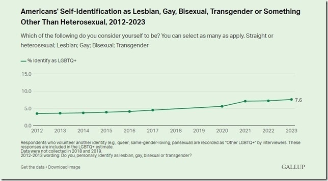 Nuo 2012 m., kai „Gallup“ pirmą kartą paklausė apie seksualinę orientaciją ir translytiškumą, suaugusių JAV gyventojų, kurie save laiko ne heteroseksualiais, procentinė dalis išaugo daugiau nei dvigubai.