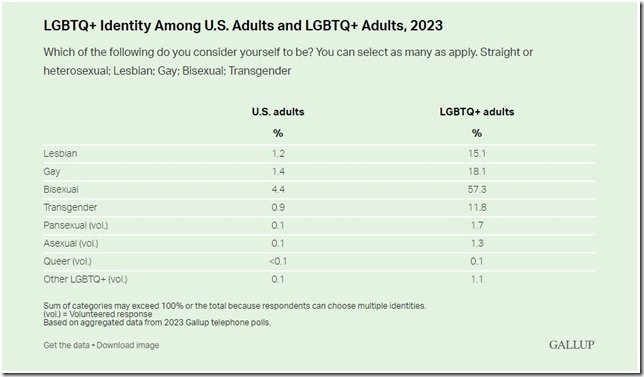 Nėra pakankamai atvejų, kad būtų galima pateikti tikslius LGBTQ+ identifikavimo tarp nebinarinių amerikiečių įverčius vien 2023 m., tačiau bendri 2022 m. ir 2023 m. duomenys rodo, kad apie 80 % nebinarinių suaugusiųjų save identifikuoja kaip LGBTQ+, trečdalis jų yra biseksualūs, o trečdalis – transseksualūs.