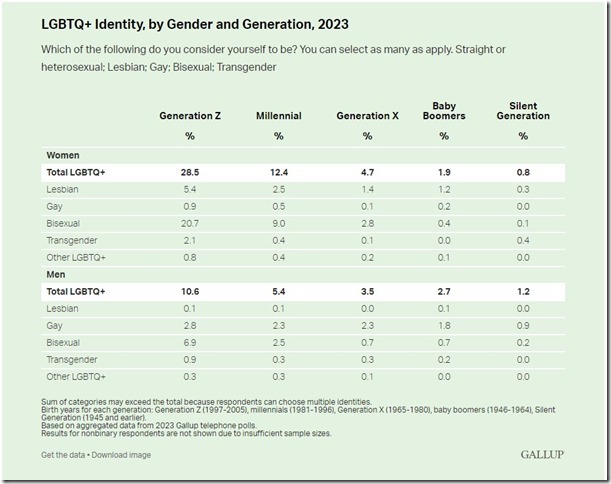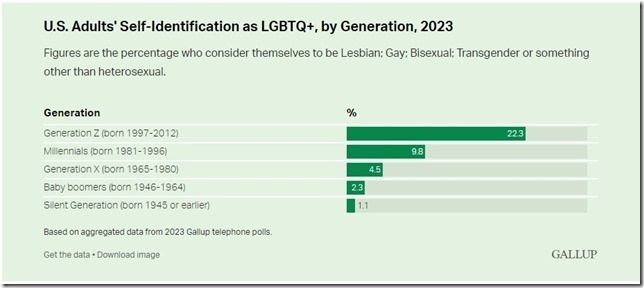 Apskritai kiekviena jaunesnė karta maždaug dvigubai dažniau nei prieš ją buvusi karta identifikuoja save kaip LGBTQ+.