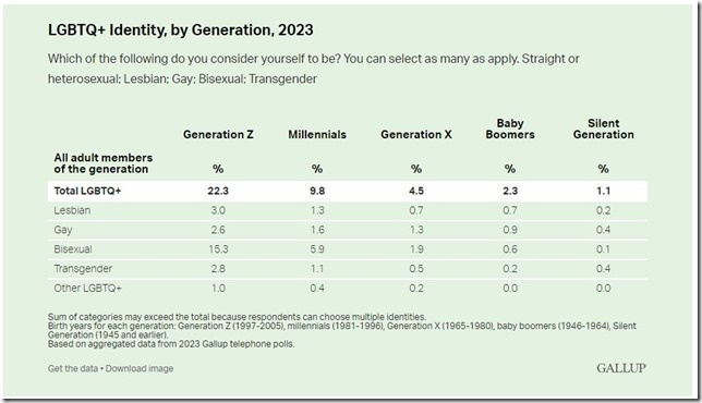 Daugiau nei vienas iš penkių Z kartos suaugusiųjų, kurių amžius 2023 m. bus nuo 18 iki 26 metų, prisipažįsta esantys LGBTQ+, taip pat beveik vienas iš dešimties tūkstantmečio kartos atstovų (nuo 27 iki 42 metų).