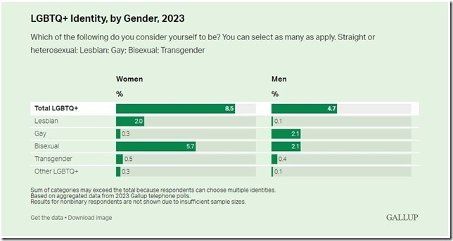 Biseksualumas yra labiausiai paplitusi LGBTQ+ identifikavimo forma tarp moterų, o vyrai vienodai dažnai identifikuojasi kaip biseksualūs arba homoseksualūs.