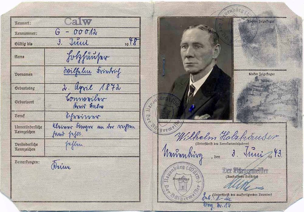 Prieš jus asmens tapatybės kortelė, patvirtinanti Trečiojo Reicho piliečio tapatybę. Dokumentas buvo išduotas Wilhelmui Holzhauseriui 1943 m. birželio mėn.