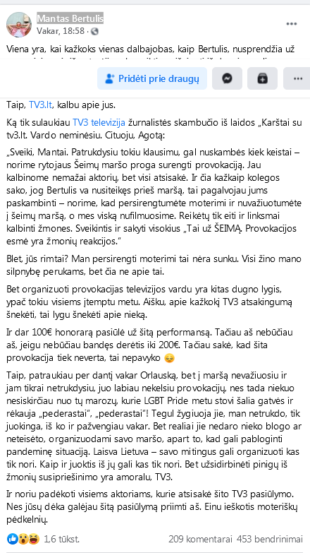 Mantas Bertulis. Televizija TV3: norime rytojaus „Šeimų maršo” proga surengti provokaciją