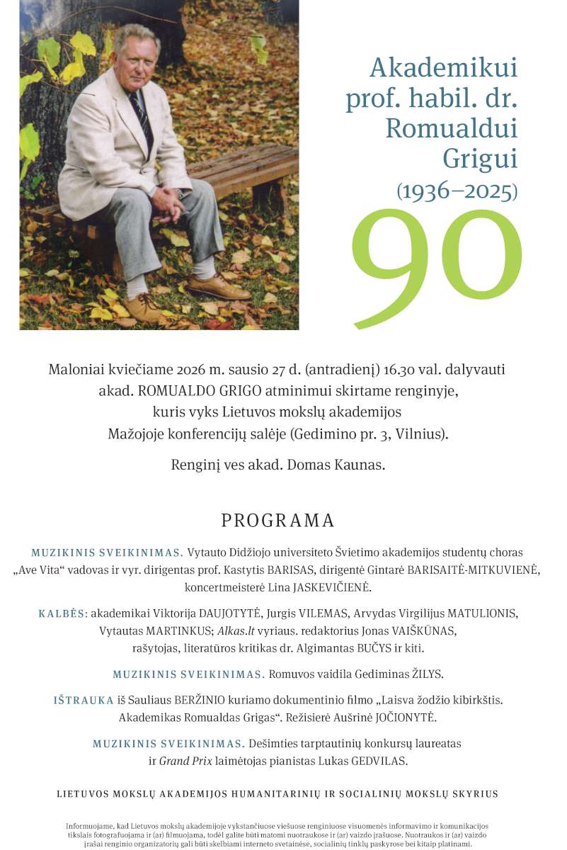 2026 m. sausio 27 d., antradienį, 16.30 val., Lietuvos mokslų akademijoje (Gedimino pr. 3, Vilnius), Mažojoje konferencijų salėje vyks akademiko, profesoriaus habilituoto daktaro Romualdas Grigas (1936–2025) 90-mečio atminimui skirtas renginys.