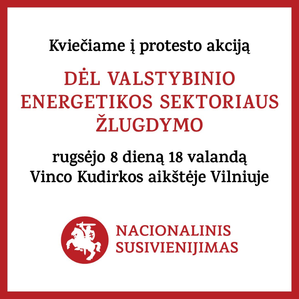 Kadangi kaip Nacionalinis susivienijimas pirmi kalbėjome apie šias problemas (iš ekspertų pirmas kalbėjo, ko gero, Kuodis), visais būdais aiškinome jas visuomenei, jaučiame teisę ir dar labiau pareigą pakviesti į protestą prieš valdžios veiksmus, o dar labiau visišką neveikimą, sprendžiant elektros sektoriaus krizę.