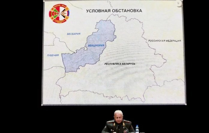Baltarusijos generalinis štabas žiniasklaidai pristatė pačių mokymų planą, kuriame didžioji Lietuvos teritorijos dalis priskirta neegzistuojančiai priešiškai „Vesbarijai“.