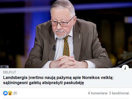 Primename, kad portalas delfi.lt paskelbė pavadinimu „Landsbergis įvertino naują pažymą apie Noreikos veiklą: sąžiningesni galėtų atsiprašyti paskubėję”. Joje rašoma, kad Vilniaus meras R.Šimašius J. Noreikos atminimo lentą suskubo nukabinti, o dėl Petro Cvirkos paminklo sostinės meras delsia, nes, pasak V. Landsbergio, bijoma „šaršalo“.