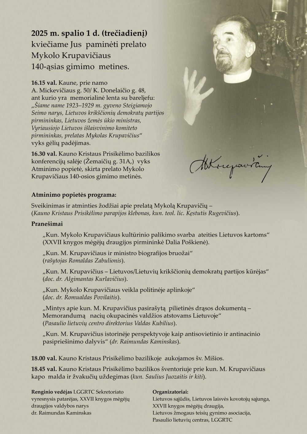 2025 m. spalio 1 d. (trečiadienį) kviečiame paminėti prelato Mykolo Krupavičiaus 140-ąsias gimimo metines.