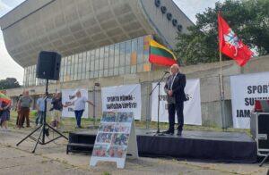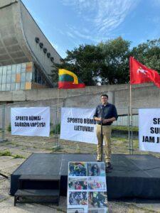 „Susirinkome ne tik minėti svarbią istorijos datą, bet ir į protestą. Protestą ne prieš žydus ir jiems svarbią atmintį, tačiau prieš istorinį neteisingumą. Laikome Vyriausybės sprendimus ne tik klaidingais, bet ir žeminančiais lietuvių tautą bei Sąjūdžio atminimą. Sporto rūmų vietoje anksčiau buvusios kapinės seniai nebeegzistuoja, XIX amžiuje jos buvo perkeltos ir kompensuotos. Buvusios kapinės visame pasaulyje, taip pat ir Vilniuje, tampa parkų, gatvių, namų ir įstaigų vieta. Nėra priežasčių, kodėl šioje vietoje buvusios žydų kapinės turėtų būti tokia globalia išimtimi. Tą suprato pasaulio žydų bendruomenių atstovai, šio amžiaus pradžioje sutikę, kad šis pastatas liktų Lietuvos visuomenės reikmėms ir net kad šalia būtų statomas konferencijų centras. Todėl Vyriausybės sprendimas sudaryti Sporto rūmų likimui spręsti sudaryti darbo grupę, kurioje dominavo užsienio šalių piliečiai ir Lietuvos kitataučiai, yra nesuprantamas pataikavimo ir Lietuvos istorijos atsisakymo pavyzdys“, – Vyriausybės sprendimą kritikavo Nacionalinio susivienijimo vicepirmininkas dr. Vytautas Sinica.