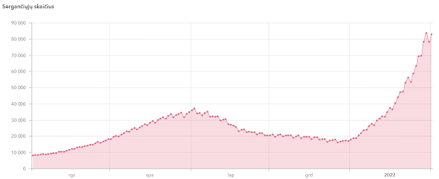 2021–09–13 naujų atvejų buvo 1103, spalio 26 d – 3632, tada netolygiai, bet mažėjo, o metų pabaigoje pradėjo augti, sausio mėnesį šoktelėjo į viršų (sausio 28 d, registruota 12025 atvejų).