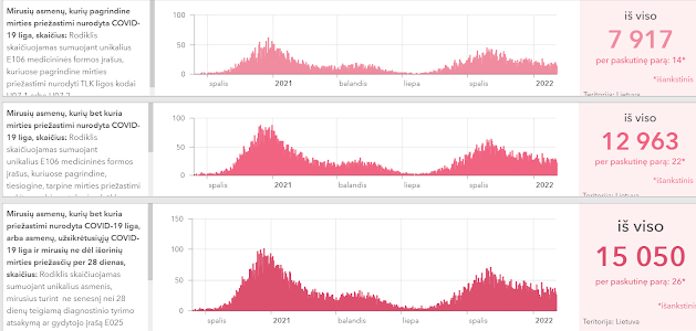 Panašiai yra ir skaičiuojant tiek pagal kitus parametrus, t.y. pagal mirusių asmenų, kurių bet kuria mirties priežastimi nurodyta COVID–19 liga, skaičių (b) ar mirusių asmenų, kurių bet kuria priežastimi nurodyta COVID–19 liga, arba asmenų, užsikrėtusiųjų COVID–19 liga ir mirusių ne dėl išorinių mirties priežasčių per 28 dienas, skaičių (c) (ketvirta lentelė).