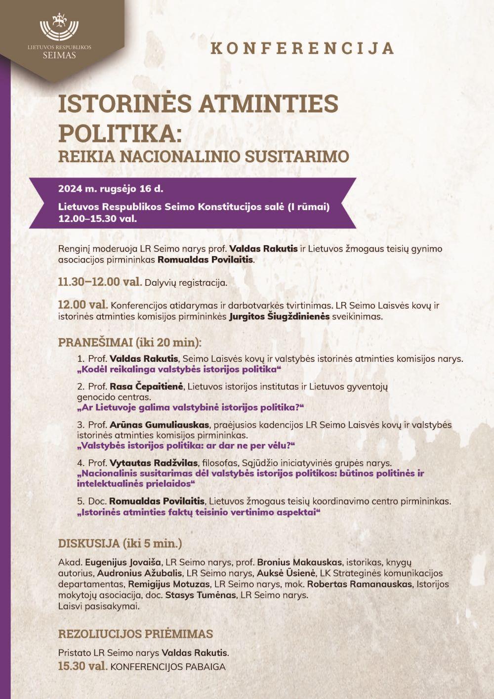 Rugsėjo 16 d. 12 val. Lietuvos Respublikos Seimo Konstitucijos salėje, vyks konferenciją „Istorinės atminties politika: reikia nacionalinio susitarimo“.