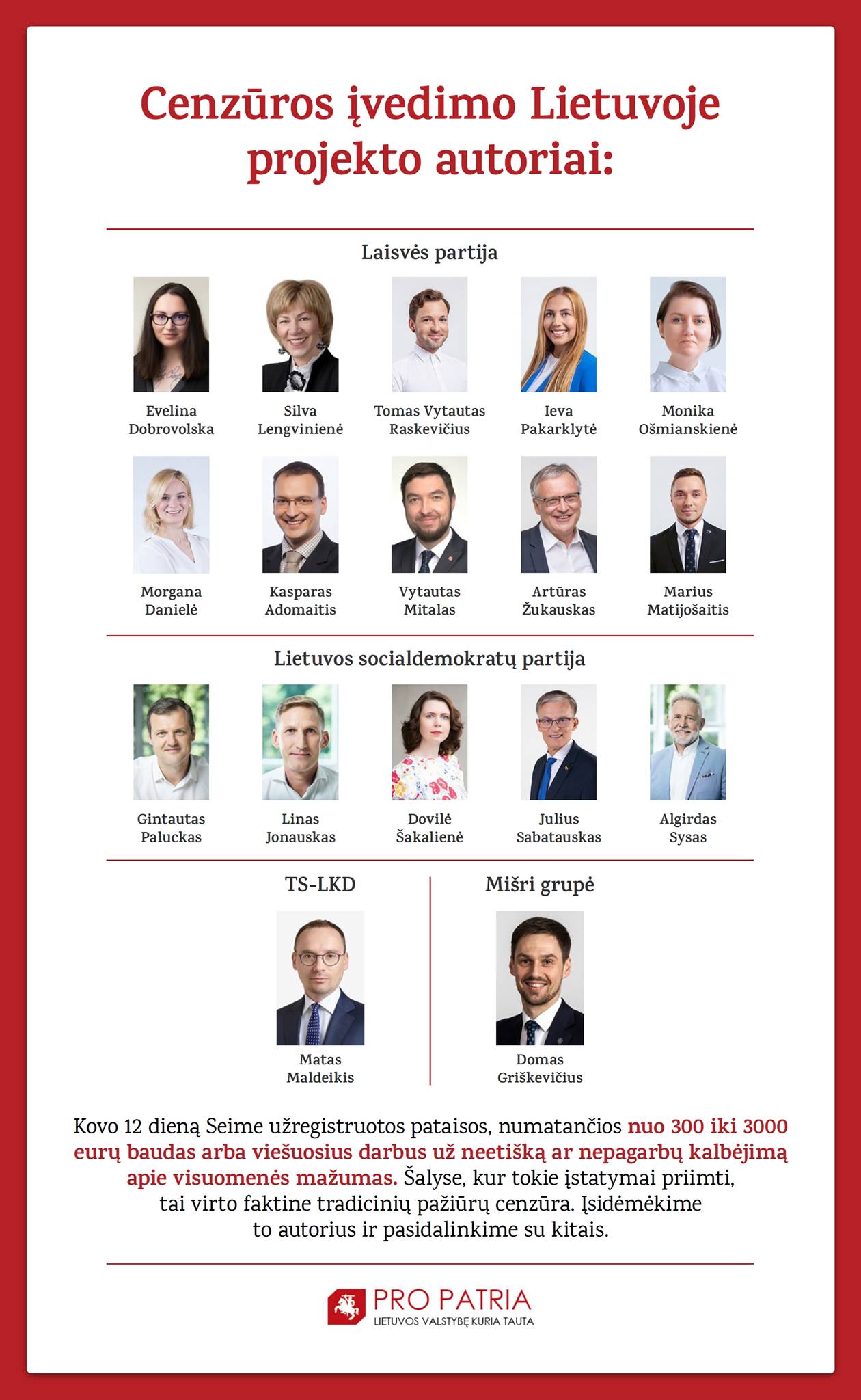 Iš to darytina išvada, kad šiuos projektus įregistravę asmenys (Evelina Dobrovolska, Silva Lengvinienė, Tomas Vytautas Raskevičius, Ieva Pakarklytė, Monika Ošmianskienė, Morgana Danielė, Gintautas Paluckas, Kasparas Adomaitis, Vytautas Mitalas, Artūras Žukauskas, Marius Matijošaitis, Linas Jonauskas, Dovilė Šakalienė, Julius Sabatauskas, Domas Griškevičius, Algirdas Sysas) arba visiškai neadekvačiai suvokia savo siūlomų įstatymų pataisų pasekmes, arba sąmoningai/nesąmoningai talkina Lietuvai priešiškoms valstybėms. Bet kuriuo atveju abu projektai prieštarauja Lietuvos Respublikos Konstitucijai ir kelia grėsmę nacionaliniam saugumui bei kenkia Lietuvos nacionaliniams interesams”,- rašoma reikalavime.