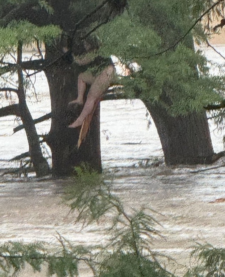 Praėjus valandai, matomos tik dviejų medžių viršūnės, nes potvynio vanduo plūsta per teritoriją.