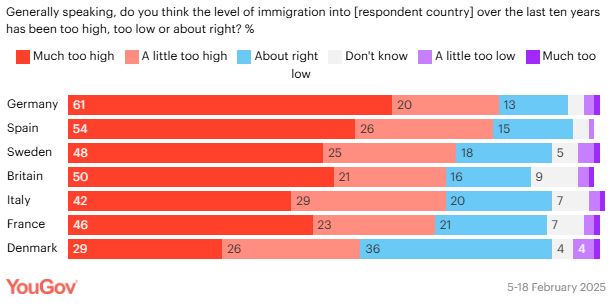YouGov apklausa buvo atlikta septyniose šalyse, įskaitant Vokietiją ir Švediją, o gauti skaičiai kalba patys už save. Vokietijoje, kad imigracija yra per didelė, teigia 81 proc. respondentų. Antroje vietoje yra Ispanija (80 proc.), o trečioje – Švedija (73 proc.).