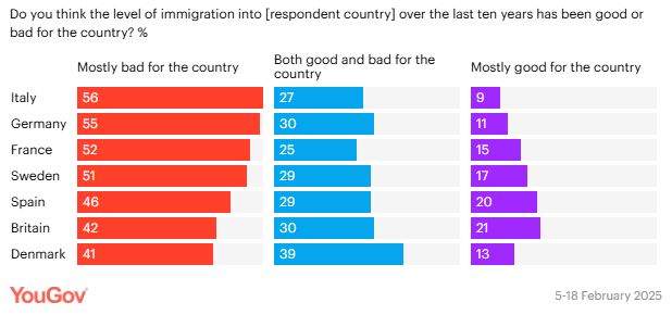 Visose apklausoje dalyvavusiose šalyse dauguma respondentų taip pat teigė manantys, kad imigracijos lygis jų šaliai dažniausiai buvo žalingas. Labiausiai linkę taip manyti italai (56 proc.), po jų seka vokiečiai (55 proc.).