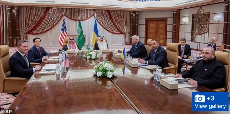 Į Saudo Arabiją atvažiavo JAV sekretorius Rubio su delegacija, Ukrainos delegacija, atvyko pats Ukrainos pasibaigusio galiojimo „prezidentas”, kuris JAV Ukrainos derybose liko sėdėti koridoriuje, Rusijos Saudo Arabijoje nebuvo „nė kvapo” ir – „Ukraina susitarė dėl 30 dienų paliaubų su Rusija..”