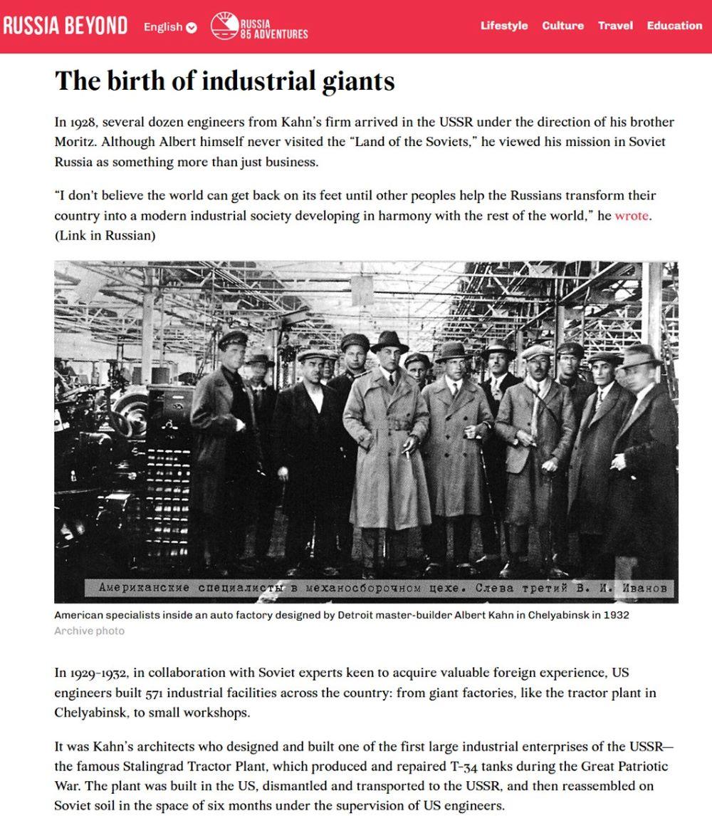 Stalingrado traktorių gamyklą suprojektavo „Albert Kahn Associates“ biuro Detroite darbuotojai, ji buvo pastatyta iš surenkamų komponentų, atgabentų iš Jungtinių Valstijų, ir aprūpinta JAV pagaminta įranga. Prižiūrint JAV inžinieriams, gamykla per šešis mėnesius buvo surinkta sovietų žemėje. Ji sulaukė tokios milžiniškos sėkmės, kad Kahno kompanija tapo vyriausiuoju sovietų vyriausybės pramoninės statybos projektuotoju ir konsultantu. „Albert Kahn Associates“ tiekdavo standartinius gamyklų planus, išsamius brėžinius, specifikacijas ir kitą techninę dokumentaciją kartu su konkrečios vietos projektais, kuriuos amerikiečių specialistai parengdavo dirbdami jau Sovietų Sąjungoje. Be to, tiek darbo vietoje, tiek vakarinių kursų metu amerikiečiai mokė sovietų inžinierius ir braižytojus unikalių „Albert Kahn Associates“ metodų ir procesų. Amerikos technologijos ir žinios buvo itin svarbios Sovietų Sąjungos gebėjimui greitai plėtoti savo pramonę. Statybų ir gamyklų paleidimo procesus prižiūrėjo amerikiečių inžinieriai. Per dešimtmetį Sovietų Sąjungoje dirbo tūkstančiai JAV specialistų. Sovietų Sąjungos sunkioji pramonė nuo 1928 m. iki 1937 m. išaugo beveik tris kartus didžiąja dalimi pasitelkus importuotą JAV įrangą ir žinias.