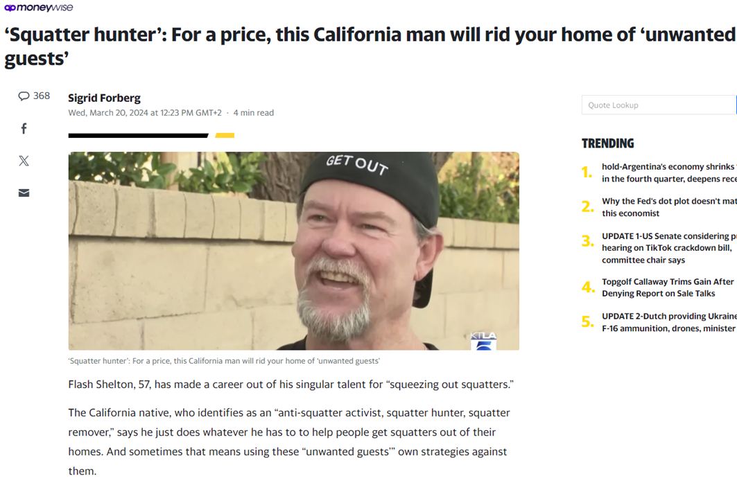 Dabar šis vyras teikia skvoterių iškeldinimo paslaugas kitiems namų savininkams. Tai tapo jo nuolatiniu darbu, o honoraras prasideda nuo 5 000 dolerių. Jo įrašai socialinėje žiniasklaidoje sulaukia milijonų peržiūrų. Jo taktika: apsigyventi su skvoteriu. Priteršti vonios kambarį. Užimti geriausią vietą ant sofos. Pasisavinti televizoriaus nuotolinio valdymo pultelį. Paleisti muziką viduryje nakties. Išgerti skvoterio kavą. Suvalgyti jo maistą.