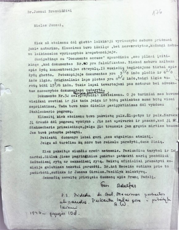 Tame pat laiške jis tęsė: „Dokumento Nr. 52 nei kitokio panašaus pavyzdžio neatsimenu. O jo turiniui mes buvome visiškai svetimi ir jis tada jeigu ir būtų patiektas mums būtų visai nepriimtas. Tada buvo toks didelis pasipiktinimas dėl vykdomų Stahleckerio pogromų. Klimaitį kiek atsimenu buvo pakvietę pulk. Šlepetys ir pulk. Narakas, jį draudė dėl pogromų vykdymo. Jis net apsiverkė ir pasakė, kad jį Stahleckeris prisaikdinęs, jeigu jis trauksis jam gresia mirties bausmė. Jam buvo patarta pabėgti.“