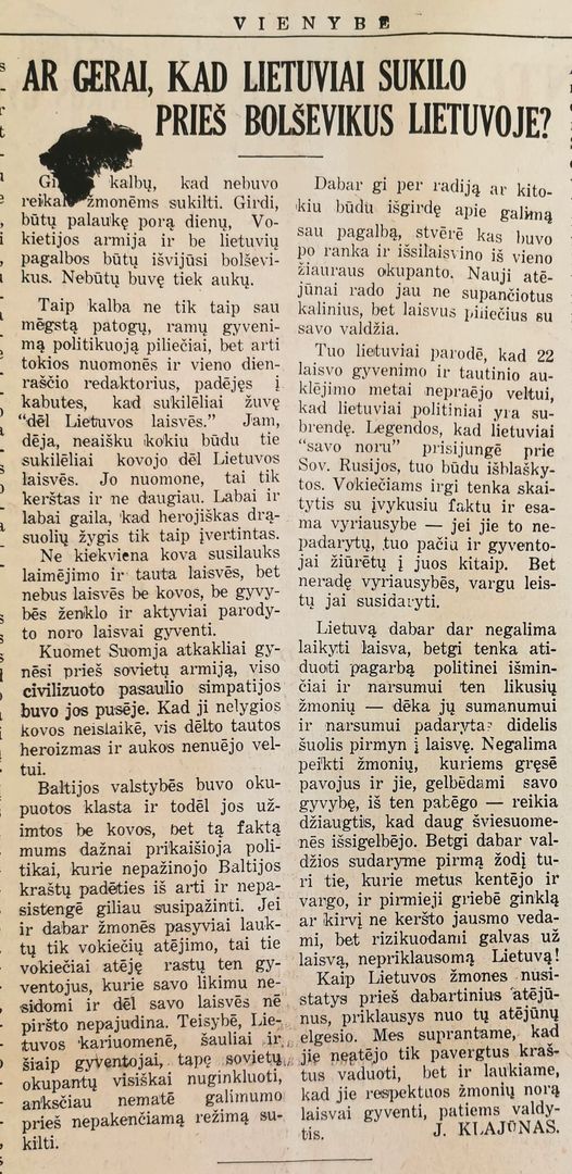 Baltijos valstybės buvo okupuotos klasta ir todėl jos užimtos be kovos, bet tą, faktą mums dažnai prikaišioja, politikai, kurie nepažinojo Baltijos kraštų padėties iš arti ir nepasistengė giliau susipažinti. Jei ir dabar žmonės pasyviai lauktų tik vokiečių atėjimo, tai tie vokiečiai atėję rastų ten gyventojus, kurie savo likimu nesidomi ir dėl savo laisvės nė piršto nepajudina. Teisybė, Lietuvos kariuomenė, šauliai ir šiaip gyventojai, tapę sovietų okupantų visiškai nuginkluoti, anksčiau nematė galimumo prieš nepakenčiamą režimą sukilti.