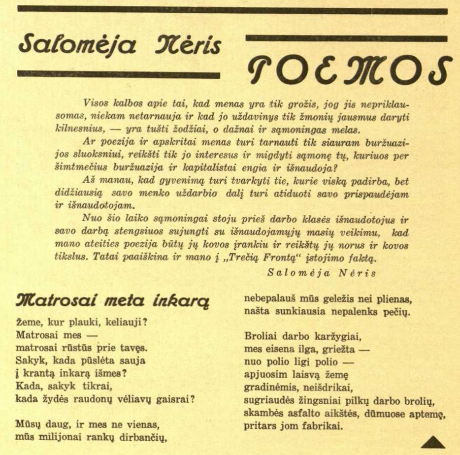 Nuo šio laiko sąmoningai stoju prieš darbo klasės išnaudotojus ir savo darbą stengsiuos sujungti su išnaudojamųjų masių veikimu, kad mano ateities poezija būtų jų kovos įrankiu ir reikštų jų norus ir kovos tikslus. Tatai paaiškina ir mano į „Trečią Frontą“ įstojimo faktą.“