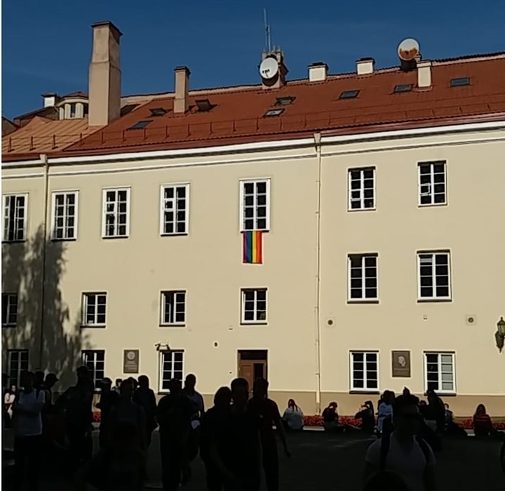 Bene gausiausiai turistų lankomame Vilniaus universiteto Filologijos fakulteto M. K. Sarbievijaus kiemelyje pakabintos dvi LGBT „vaivorykštės“ vėliavos. Socialiniame tinkle „Facebook“ apie tai pranešta iš oficialios Filologijos fakulteto paskyros.