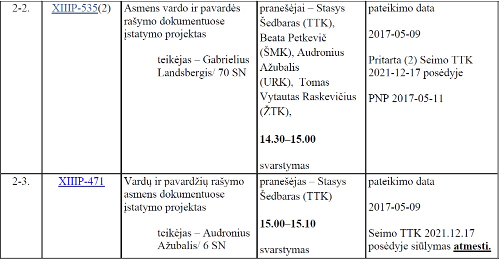 Visuomenėje didelį atgarsį turinčius asmenvardžių rašybos asmens tapatybės dokumentuose įstatymų projektus Seimas turėtų svarstyti gruodžio 21 d., antradienį, 14.30–15.10 val. Balsavimas dėl projektų darbotvarkėje yra numatytas 15.45–16.15 val.