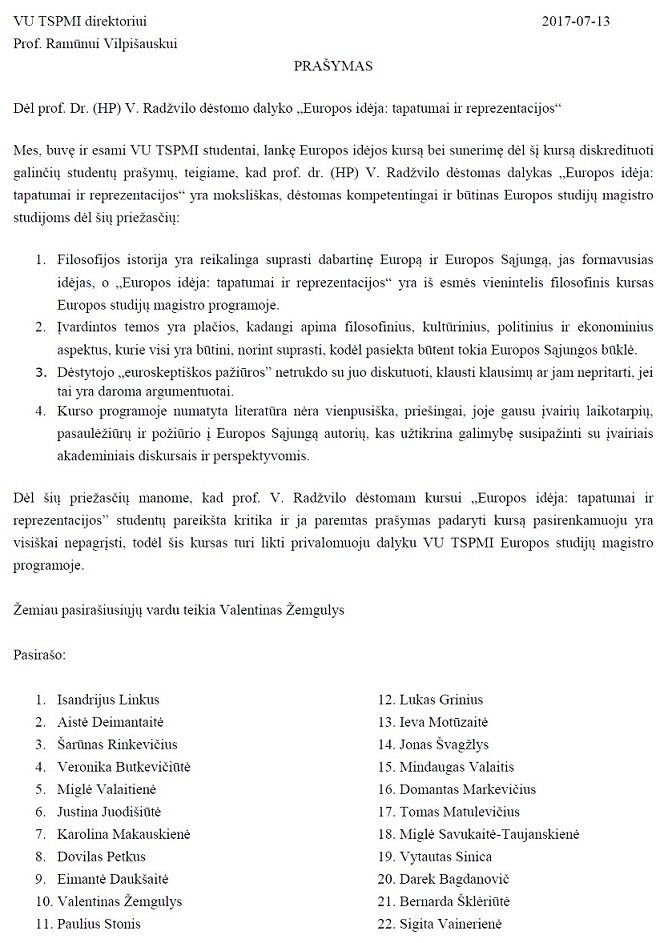 „Prašymas, kuriuo rėmėsi administracija, teigė, kad profesoriaus Radžvilo kursas yra nesusijęs su Europos studijomis, dėstomas labai plačiomis temomis, o dėstytojo „euroskeptiškos pažiūros“ ir „subjektyvus požiūris“ esą iškreipia supratimą apie Europos Sąjungą ir neleidžia susipažinti su esamu platesniu akademiniu diskursu. Motyvuojant šiais keturiais argumentais prašyta kursą pakeisti iš privalomojo į pasirenkamą. Kaip vėliau komentavo jo iniciatorė, „kad jį galėtų lankyti tie, kam priimtinos profesoriaus pažiūros“. Visi lankėme šį profesoriaus kursą ir esame įsitikinę, kad visi paminėti argumentai neatitinka tikrovės, todėl nepagrįstas yra ir jais paremtas prašymas keisti esamą privalomo kurso statusą“, – teigia prašymą pasirašęs VU TSPMI alumnas Isandrijus Linkus.